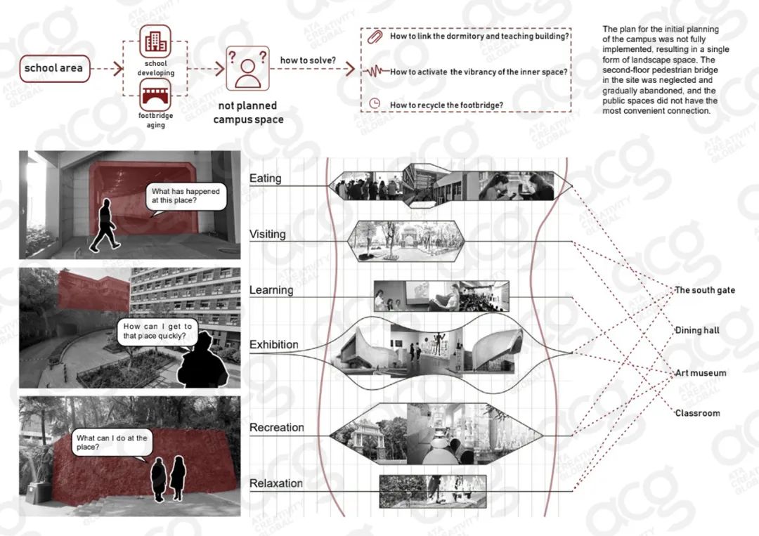 其中最好玩的地方就是貫穿整個(gè)校園的一個(gè)人行天橋,但是出于管理方面的問題一直沒有被使用。所以我從這個(gè)點(diǎn)切入,通過重新設(shè)計(jì)天橋與周邊的景觀節(jié)點(diǎn)來激活整個(gè)校區(qū)的交通系統(tǒng)與場(chǎng)地活力。