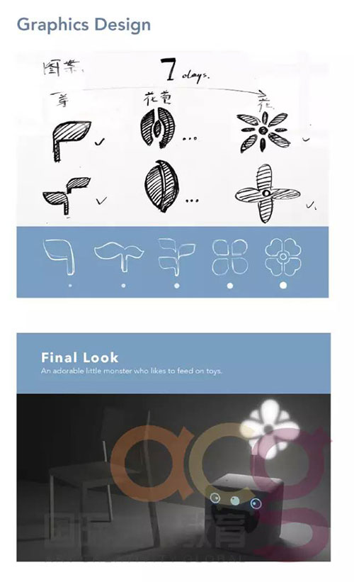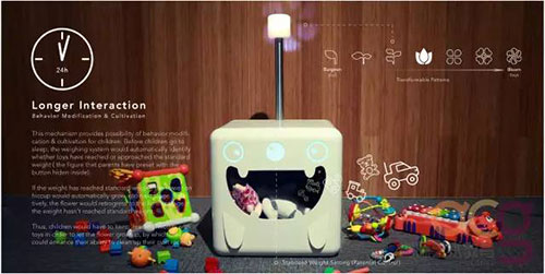 每當(dāng)夜幕降臨,小怪獸內(nèi)部的重量感應(yīng)器就會(huì)計(jì)算出兒童一天收納的玩具總量,并且根據(jù)數(shù)量投射出不同形狀的光圈:數(shù)量如果多于昨天,那么光圈的形狀會(huì)從一顆小嫩芽開(kāi)始慢慢進(jìn)化為一朵花;反之,會(huì)退化。通過(guò)這樣的形式,形成長(zhǎng)期互動(dòng),鼓勵(lì)兒童,并且成為他們的情感寄托。