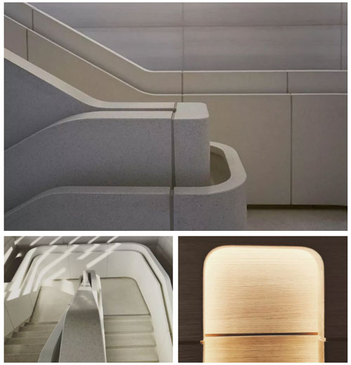 “圓”是蘋(píng)果公園中最常見(jiàn)的視覺(jué)元素,蘋(píng)果公司產(chǎn)品的標(biāo)志性“曲率圓角”在空間中被放大至不同尺度,并融入“懸浮”屋頂、玻璃幕墻、樓梯扶手的細(xì)節(jié)設(shè)計(jì)中。